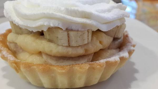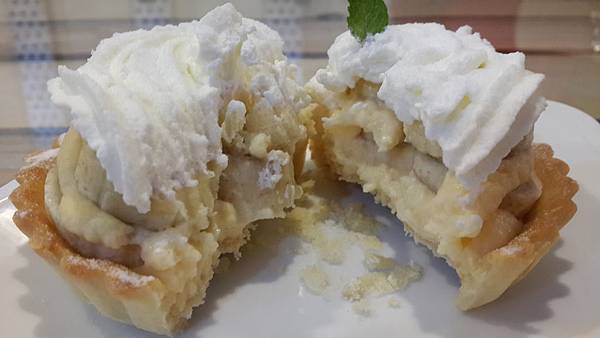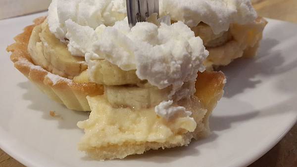 剛剛看到上面是一層奶油的香蕉塔,我原本想說可能會很甜,吃起來的味道還好,不會很甜,很清爽。