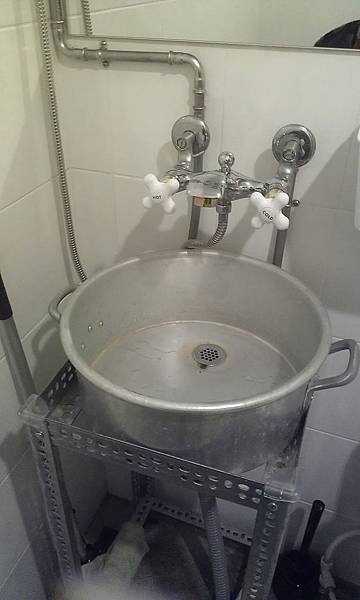 原本已經要走出店門了的sally被去洗手間的弟妹叫住,跟我說有一個地方很特別,一定要去看一下,原本想說店裡的東西我都有拍到了,還有那邊是我沒有拍到的嗎,結果是洗手間的洗手檯,洗手盆居然是一個鍋子,真的很特別哦!